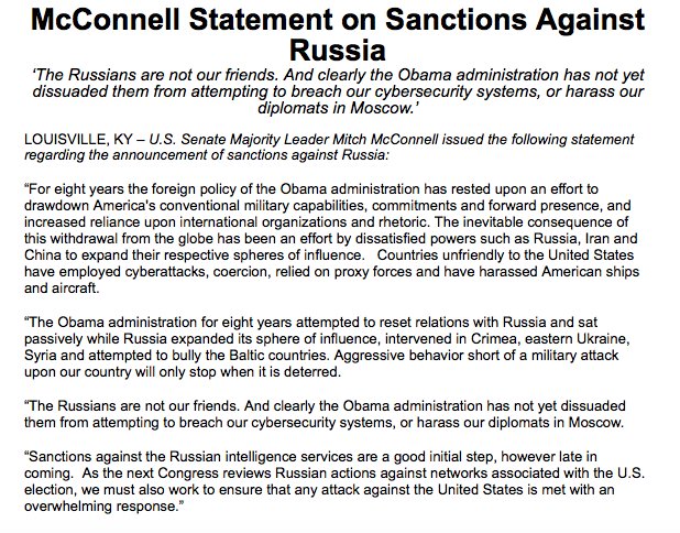 Enfatizó que los rusos no son amigos de los Estados Unidos. “Está claro que el Gobierno de Obama todavía no les disuadió de intentar violar nuestros sistemas de seguridad cibernéticos o de acosar a nuestros diplomáticos en Moscú", dijo McConnell.