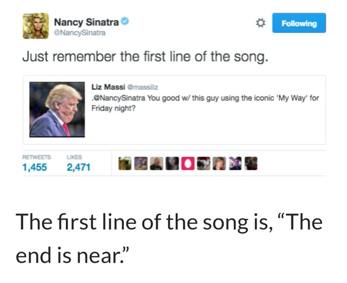 @NancySinatra @realDonaldTrump prefect song for a pres that has been scandalous before sworn in. #theendisnear