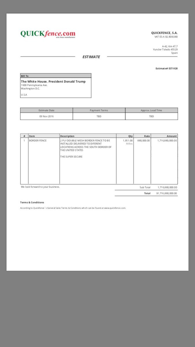 En otros apartados del documento se preven 1.951 millas (es decir, la parte entera de muro que falta por construir), se informa del precio de cada milla de valla (880.000 dólares), y se detalla el precio final, que serían 1,716.880.000,00 dólares. Aunque Donald Trump insistió durante la campaña en que sería México quien pagaría el muro, QuickFence prefirió enviarle el presupuesto a él.