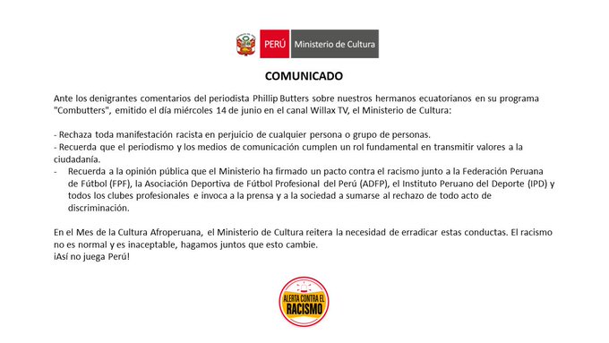 El Ministerio de Cultura del Perú también se ha pronunciado respecto a este tema. Ha señalado que "rechaza toda manifestación racista" y recuerda que el periodismo y los medios de comunicación cumplen con el papel fundamental de "transmitir valores a la ciudadanía".