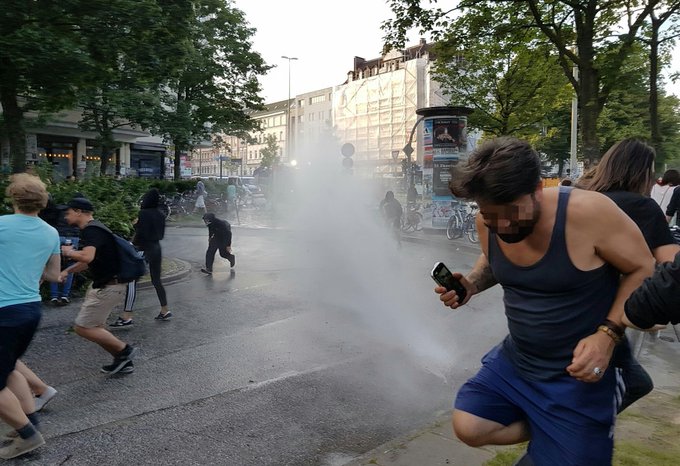 La policía trata de repeler cualquier movimiento encerrando a la gente en el barrio de St. Pauli. Volvieron a emplear spray pimienta #NoG20