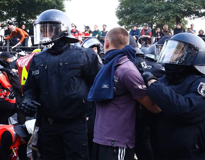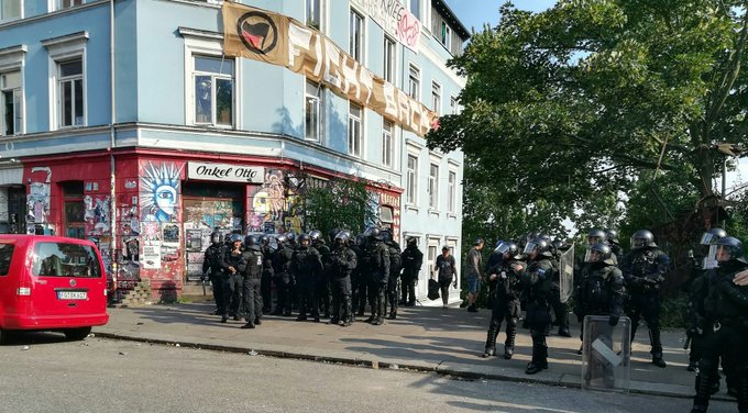 A las puertas del #RoteFlora se desató el caos. La policía pide a medios e individualidades que no difundan su actuación durante el #NoG20