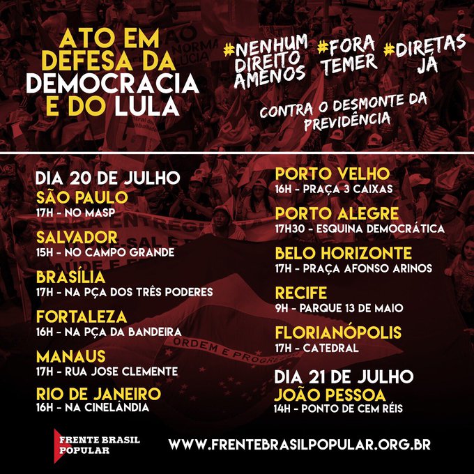 En relación a la condena de Lula, el FBP afirmó que no existen pruebas que justifiquen la condena a nueve años y medio de prisión y explican que la propuesta de las movilizaciones es "relacionar la persecución al ex presidente con la agenda de retroceso en las leyes laborales y reafirmar, frente a este cuadro de intensa crisis política e institucional, la necesidad de la realización de elecciones directas para la presidencia de la República".