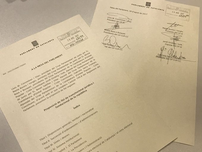 Los partidos catalanes independentistas Junts pel Sí y la CUP han presentado este lunes en el Parlament la Ley de Transitoriedad Jurídica y Fundacional de la República, que se plantea como la principal ley de desconexión con el Estado español.