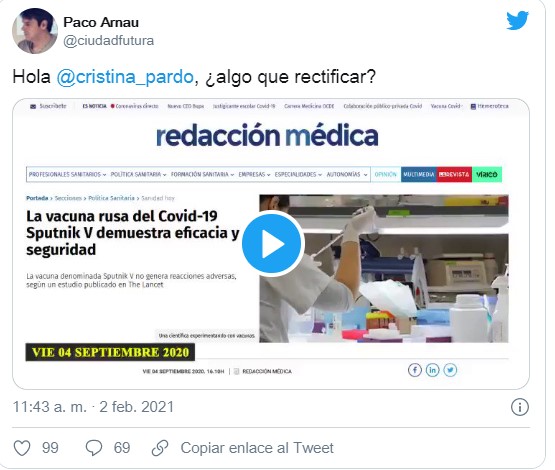 Curiosamente, tras esta intensa campaña de cuestionamiento, en su más reciente video al respecto, el periodista y médico argentino se mostró "contento" de ver los resultados de la vacuna rusa en The Lancet. "Nada de lo que aquí dijimos se vio desmentido", dijo aparentemente satisfecho el periodista, autor tan solo un mes antes de un video en el que se refiere al desarrollo de la vacuna Sputnik V como "un cuento ruso".