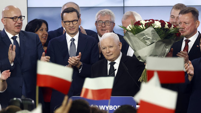 Foto.- El viceprimer ministro polaco y líder del partido Ley y Justicia (PiS), Jaroslaw Kaczynski (C) y el primer ministro polaco Mateusz Morawiecki (3L) del partido Ley y Justicia reaccionan con sus partidarios en la sede del partido en Varsovia, Polonia, en octubre. 15 de septiembre de 2023