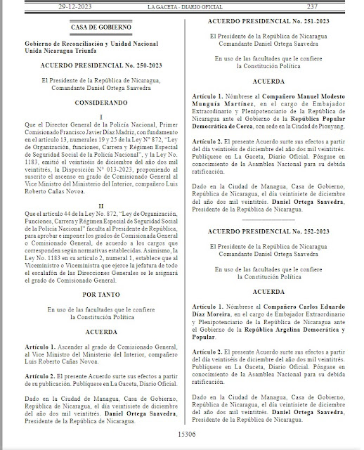 Dado en la Ciudad de Managua, Casa de Gobierno. República de Nicaragua, el día veintisiete de diciembre del año dos mil veintitrés.
