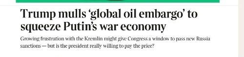 Por último, en previsión del supuesto “gran anuncio” de Trump del lunes, varios medios de comunicación informan que Trump se prepara para lanzar un embargo petrolero global sin precedentes contra Rusia: