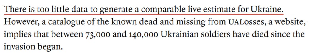 Lo desconcertante es que esta metodología simplista también se aplique a las Fuerzas Armadas de Ucrania, pero cuando se trata de las pérdidas de Ucrania, el equipo de The Economist no muestra la menor curiosidad: