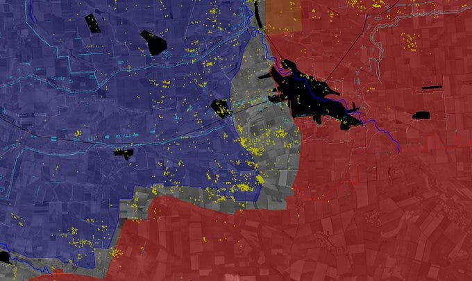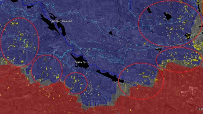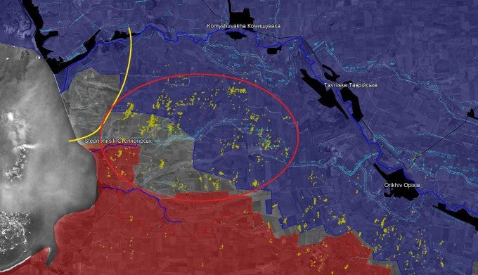 Lo que se ve arriba es que sólo en el frente de Gulyaipole —donde aparentemente la AFU ha concentrado su artillería restante— hay una cantidad apreciable de ataques ucranianos detrás el LOC en territorio controlado por Rusia.