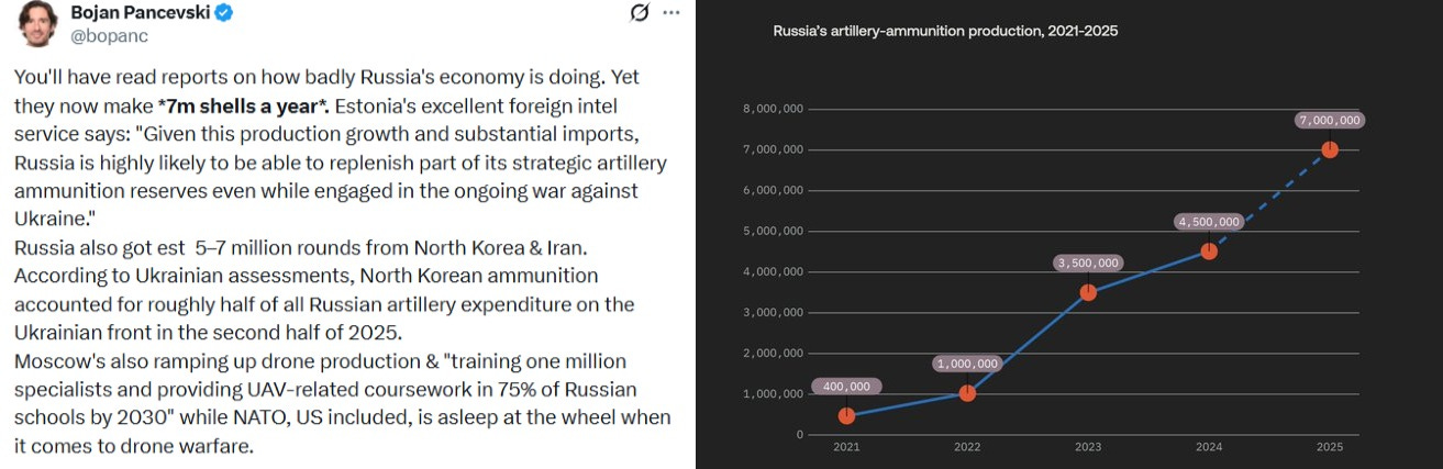 Por ejemplo, la adquisición total de proyectiles de artillería por parte de Rusia en 2025 fue de 3,4 millones, según el informe.